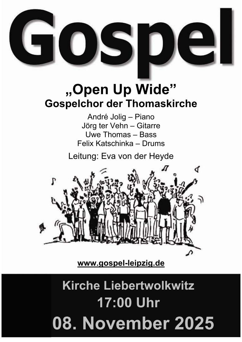 - 08. November, 17:00 Uhr, Samstag: Konzert des Gospelchores der Thomaskirche in der Kirche Liebertwolkwitz