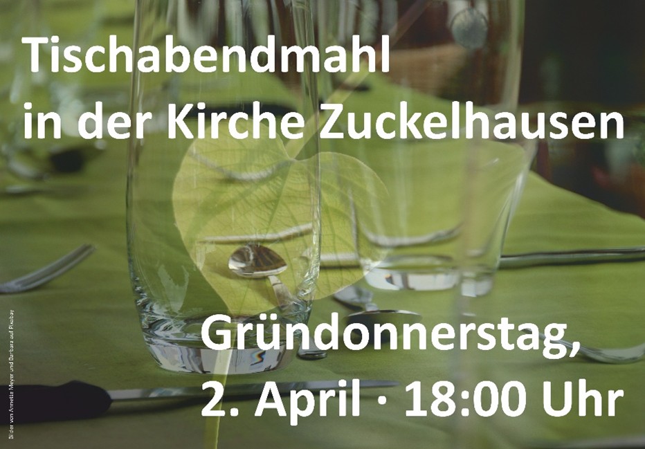 - 02. April, 18:00 Uhr, Gründonnerstag: Gottesdienst mit Tischabendmahl in der Kirche Zuckelhausen.