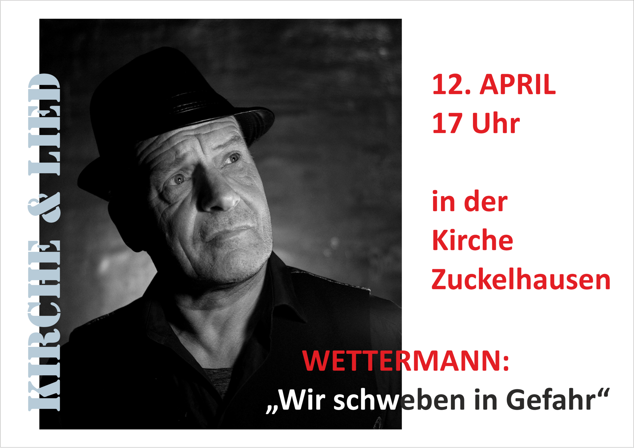 - 12. April, 17 Uhr, Quasimodogeniti: Kirche und Lied mit WETTERMANN – „Wir schweben in Gefahr“ in der Kirche Zuckelhausen.
