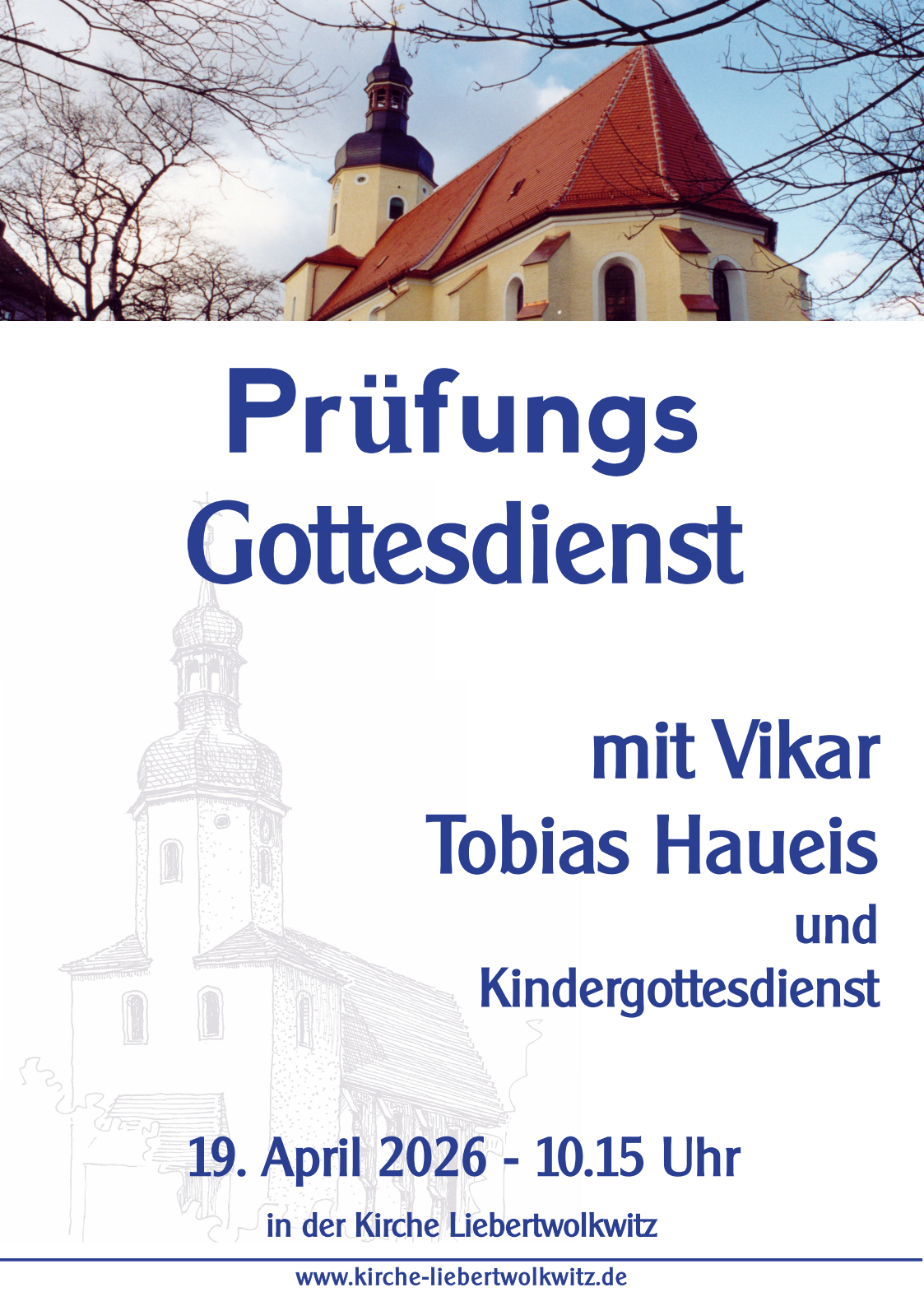 - 19. April, 10:15 Uhr, Miserikordias Domini: Prüfungsgottesdienst Vikar Haueis mit Kindergottesdienst in der Kirche Liebertwolkwitz.